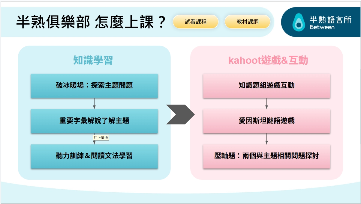 半熟語言所遊戲式互動課【半熟俱樂部】將於 8/18 重磅上線囉!這是一個輕量型的沉浸式課程、E/I人都合適、結合「互動式遊戲教學」的創新課程。我們將以冷知識(trivia)為核心,帶你輕鬆探索各式各樣的有趣主題。這不僅能讓你以適中的強度持續學習英文,還能在輕鬆愉快的氛圍中吸收新知、激發好奇心。上完課,保證你的「奇怪知識」會瞬間暴增!